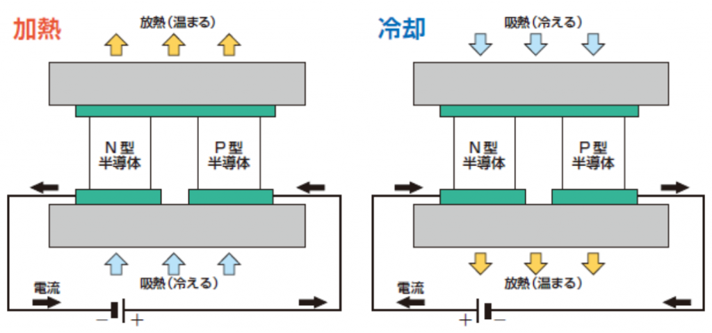 By switching the direction and strength of the flowing current, both heating and cooling temperature control is possible.