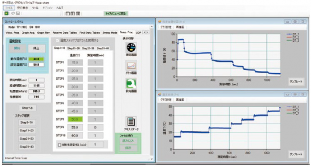 Since the Pelche element is characterized by a quick response to temperature control, it is possible to perform measurements to evaluate the temperature dependence of viscosity in a short time by using the temperature program of the attached viscosity data acquisition software (Visco-Chart).