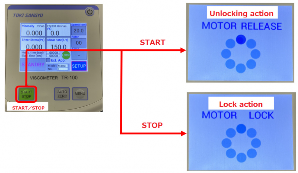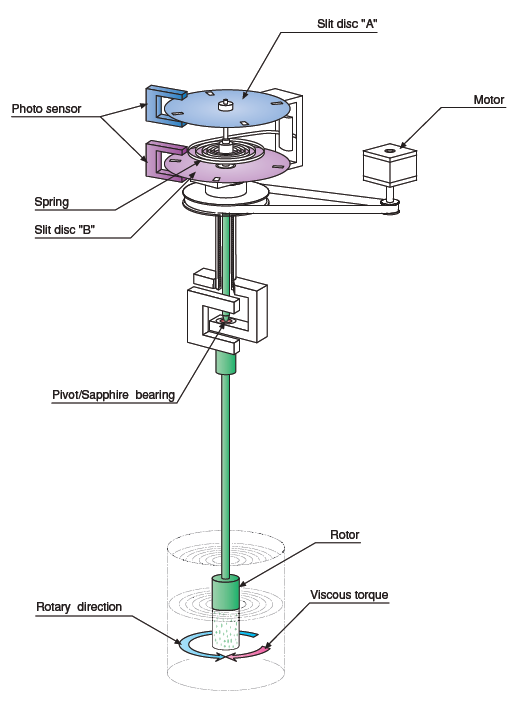 1. Rotation of the motor is transmitted to the rotor via the spiral spring, and viscous torque acts on the rotor rotating in the measured liquid.