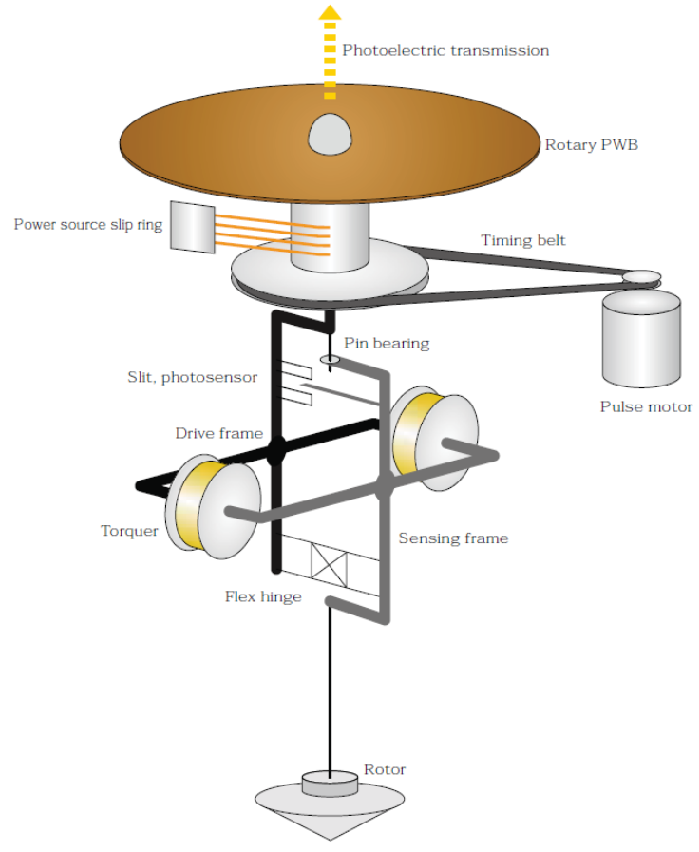 The viscous torque detector is divided into a drive frame and a sensing frame, which are connected by a flex pivot. A feedback current flows through the Torquer so that the deviation between the drive frame and the sensing frame generated during measurement becomes zero, pushing the sensing frame back. This measurement method is a measurement method that always returns the deviation to zero (equilibrium) and is called the “zero position method”.Due to the “pivotless mechanism” that does not use the jewel bearing used in conventional viscometers, it has excellent linearity and reproducibility even in a wide measurement range.