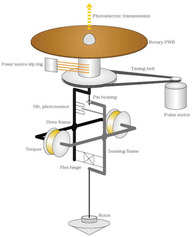 A feedback current flows through the Torquer so that the deviation between the drive frame and the sensing frame generated during measurement becomes zero, pushing the sensing frame back.