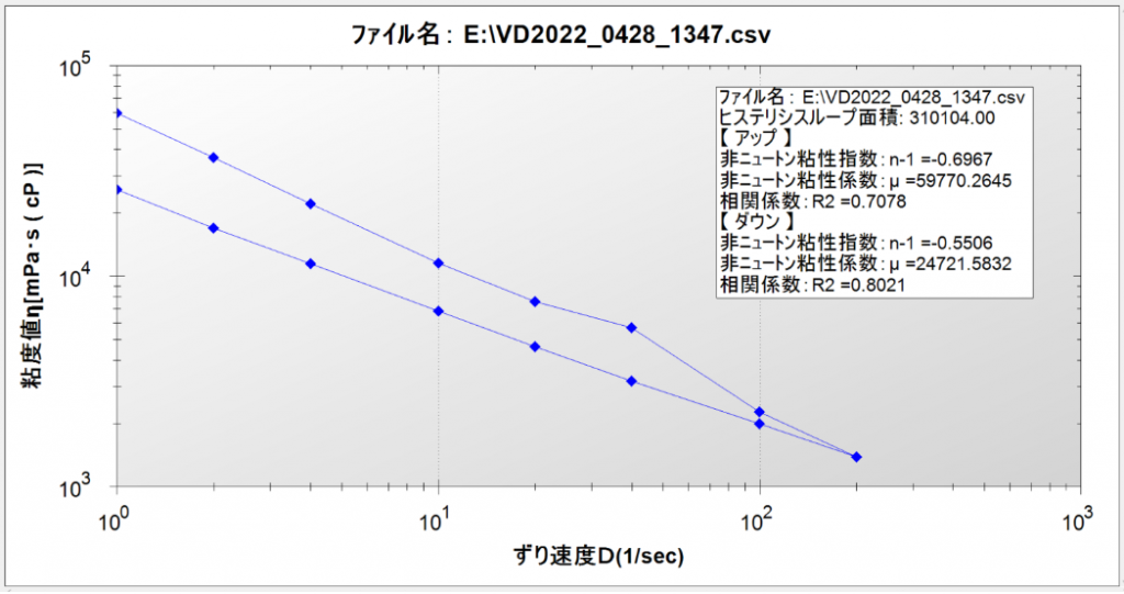 In addition, the simple analysis function can calculate the “hysteresis loop area” and “non-Newtonian viscosity index”.